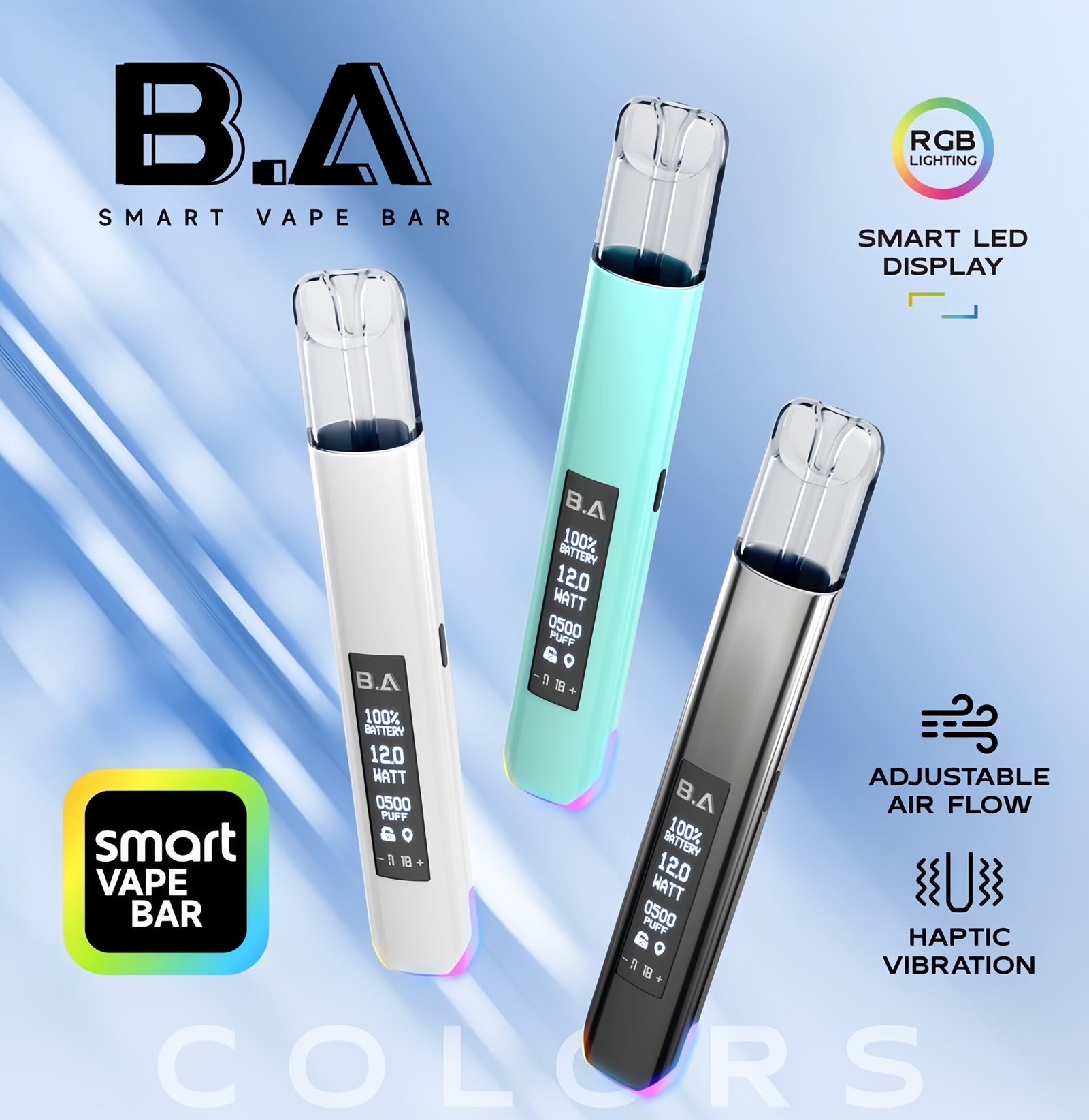 全新B.A一代主機  全新設計LED可調式顯示屏主機,為用戶提供了一款集時尚設計、智能溫控與高效續航於一體的高端Vape主機體驗。B.A一代主機採用高端漆面工藝,呈現獨特的光澤和質感,這款主機不僅時尚大氣,更是能彰顯使用者的高貴品味和獨特個性。