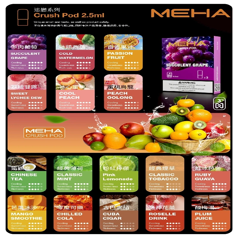 MEHA五代煙彈震撼登場,專為追求極致口感的潮流用戶打造!這款電子煙煙彈擁有2.5ml的大容量設計,配合創新雙重霧化技術,能夠精準還原豐富的層次風味。無論是清爽的水果系還是醇厚的經典菸草,MEHA電子煙彈都能滿足你對口感的所有渴望。